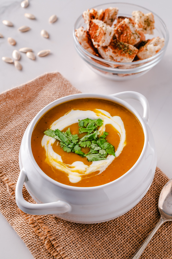 This velvety smoooth, satisfying and flavourful Pumpkin soup will grace your table in 1/2 a hour